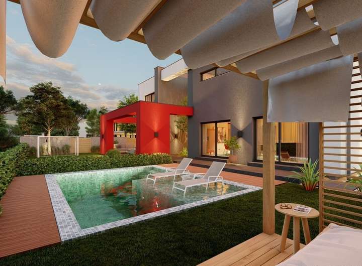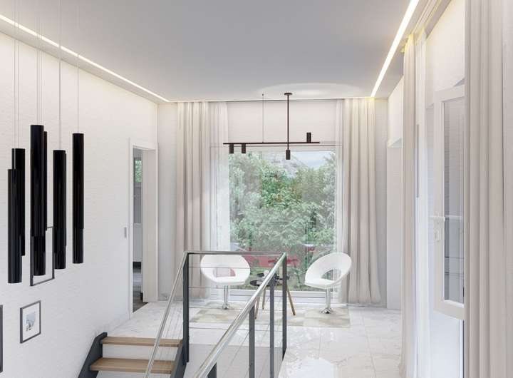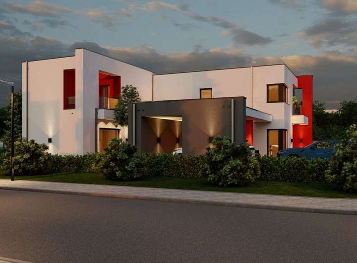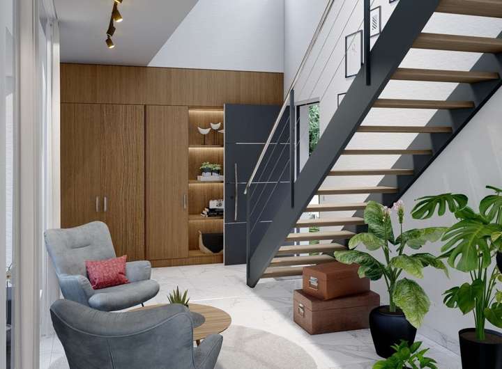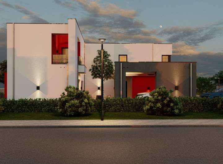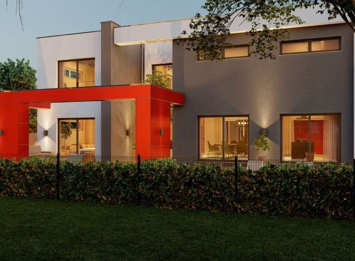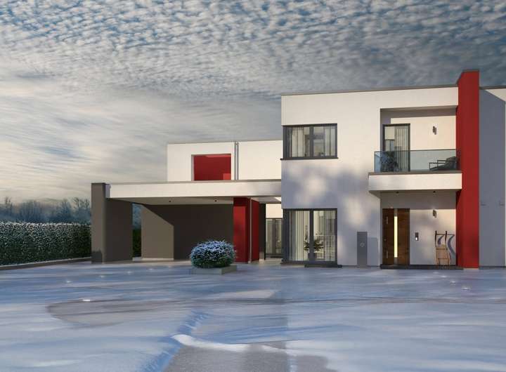 Das Einfamilienhaus, inspiriert vom ikonischen Bauhaus-Stil, besticht als echtes Design-Highlight und verbindet eine durchdachte Raumaufteilung mit zahlreichen Extras, die das Wohnen hier besonders angenehm machen. Es bietet ausreichend Platz für die gesamte Familie und ermöglicht die harmonische Verbindung von Leben und Arbeiten unter einem Dach. Im Erdgeschoss befindet sich neben dem offenen Koch- und Essbereich sowie dem Wohnzimmer auch ein heller Arbeitsraum. Zudem finden der Hauswirtschaftsraum und ein Dusch-WC bequem Platz auf dieser Ebene. Im Obergeschoss beeindruckt das Haus mit einer großzügigen Eltern-Suite, die ein eigenes Dusch-WC, eine Ankleide und eine Loggia umfasst, auf der die ersten Sonnenstrahlen des Tages genossen werden können. Darüber hinaus gibt es zwei Kinderzimmer mit eigenem Bad und Balkon sowie eine Galerie. Ein zusätzlicher Wohnraum kann flexibel für Hobbys, als weiteres Kinderzimmer oder zur Unterbringung von Gästen genutzt werden.