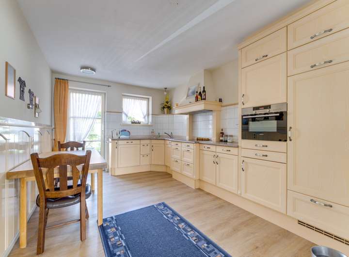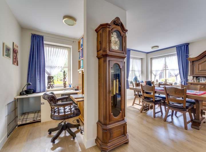 Beim Betreten fällt sofort das gepflegte Erscheinungsbild auf. Der großzügige Eingangsbereich bietet Zugang zum Gäste-WC und den zentralen Wohnbereichen im Erdgeschoss. Wohn- und Esszimmer erstrecken sich zusammen über ca. 55 m² und sind dank großer Fenster wunderbar hell. Hier gibt es ausreichend Platz für eine großzügige Sitzecke und einen großen Esstisch, und der Garten lässt sich durch Türen problemlos in das Wohnerlebnis integrieren. Angrenzend befindet sich die moderne, ca. 15 m² große Küche, die ausreichend Platz für alle bietet, die gerne kochen und Gäste bewirten.