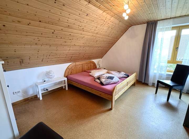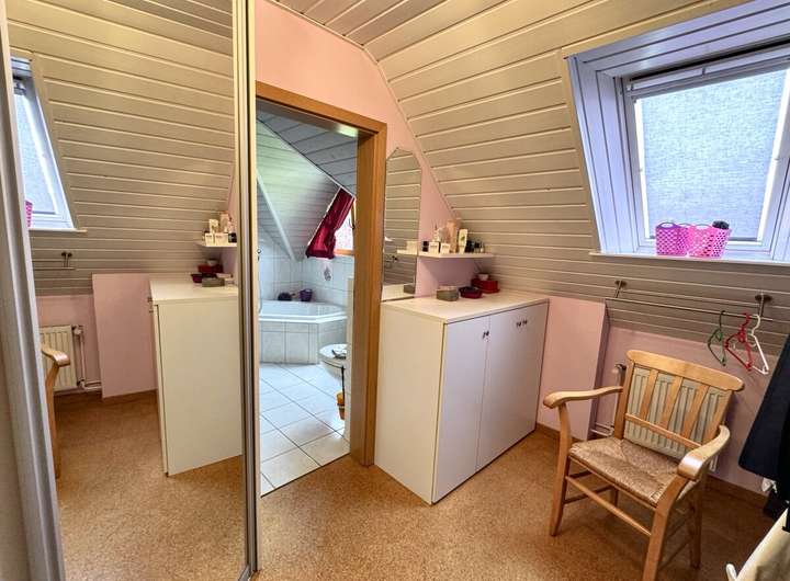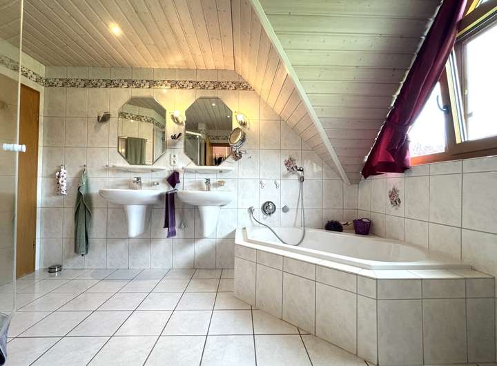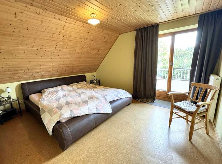 Im Obergeschoss befinden sich vier Schlafzimmer, ein Tageslichtbad mit Dusche und Badewanne, eine Ankleide sowie ein Balkon. Eine Empore erweitert den Raum zusätzlich. Der isolierte Dachboden mit Velux-Dreiecksfenstern bietet Ausbaupotenzial für ein Studio, Atelier oder zusätzlichen Wohnraum - perfekt auch für eine zweite Wohneinheit oder für Kinder im Jugendalter.