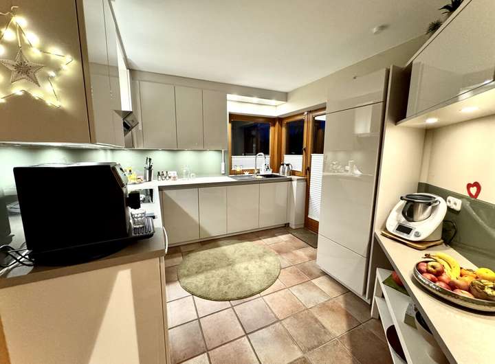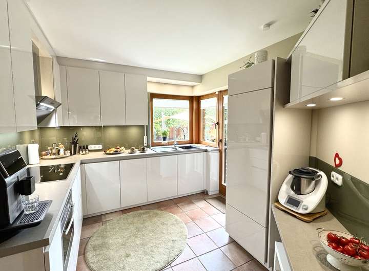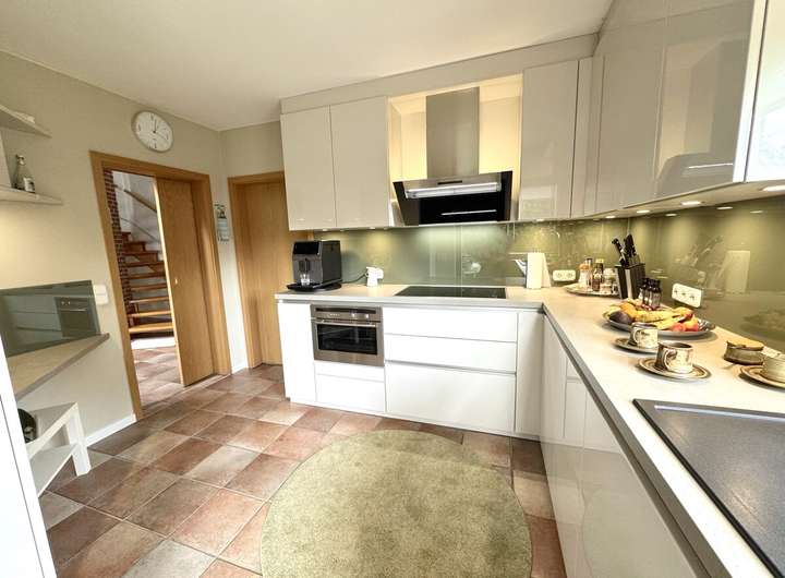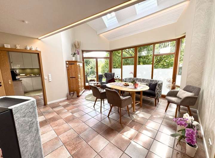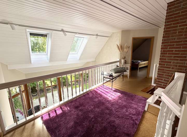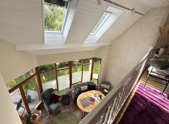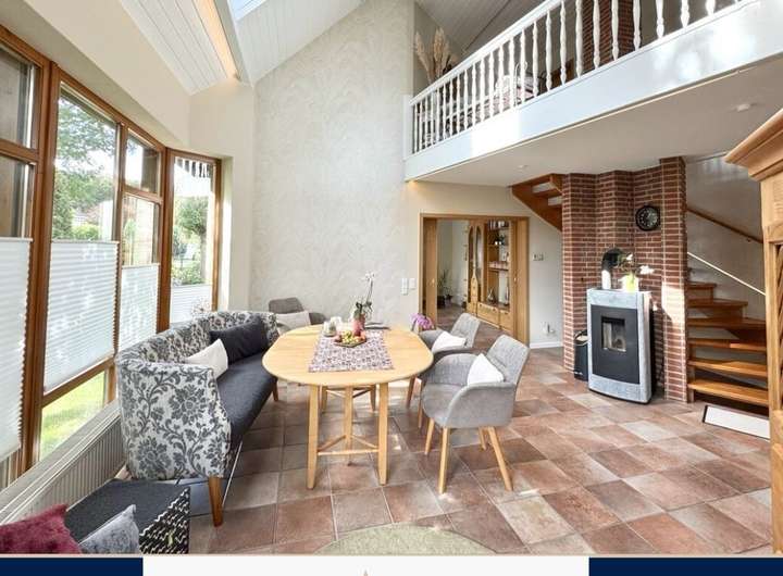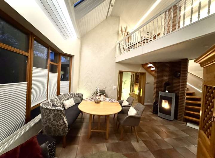 Das Haus wurde zwischen 2018 und 2023 umfassend modernisiert und befindet sich in einem äußerst gepflegten Zustand. Neue Heizung, Fenster, Dach und Innenausbau entsprechen heutigen technischen wie ästhetischen Ansprüchen. Großzügige Fensterflächen lassen viel Tageslicht ins Haus, die offene Galerie und die Raumhöhe von über fünf Metern im Wohnbereich schaffen ein außergewöhnliches Wohngefühl.