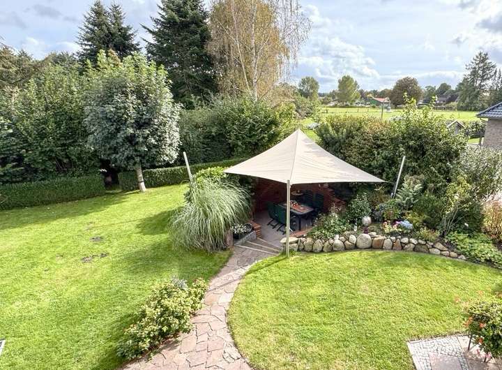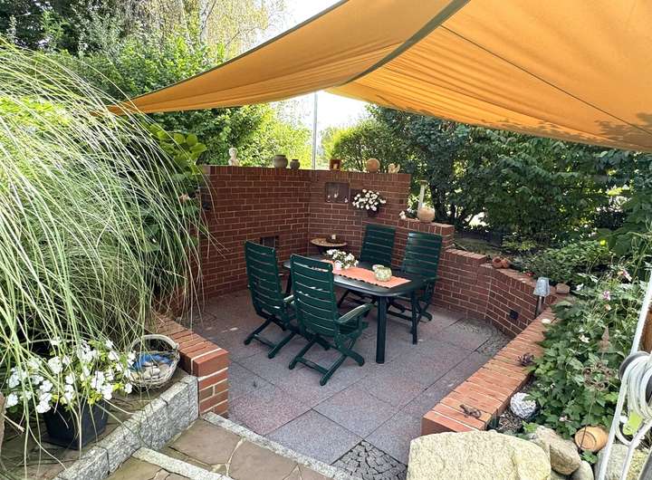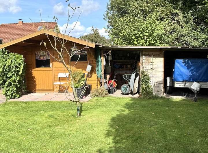 Der Außenbereich ist liebevoll angelegt: Ein gepflegter Garten, verschiedene Sitzplätze, ein Gartenhaus, ein gepflasterter Grillplatz sowie eine hochwertige Terrassenüberdachung mit Sonnensegel bieten Raum für Erholung und Begegnung. Zwei separate Zufahrten, eine davon auf der Rückseite des Grundstücks, und ein eigener Stellplatz für Anhänger oder Zweitfahrzeuge bieten zusätzlichen Komfort. Die Garage ist isoliert, gefliest und direkt ans Haus angebunden.
