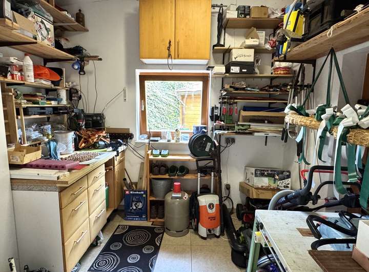 Im Erdgeschoss stehen außerdem ein großes Arbeitszimmer, ein Gäste-WC, eine Sauna sowie ein Hauswirtschaftsraum mit zusätzlicher Küchenzeile zur Verfügung. Von hier aus ist der Zugang zur Garage, zur Werkstatt und zum Garten möglich.