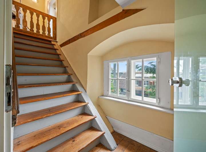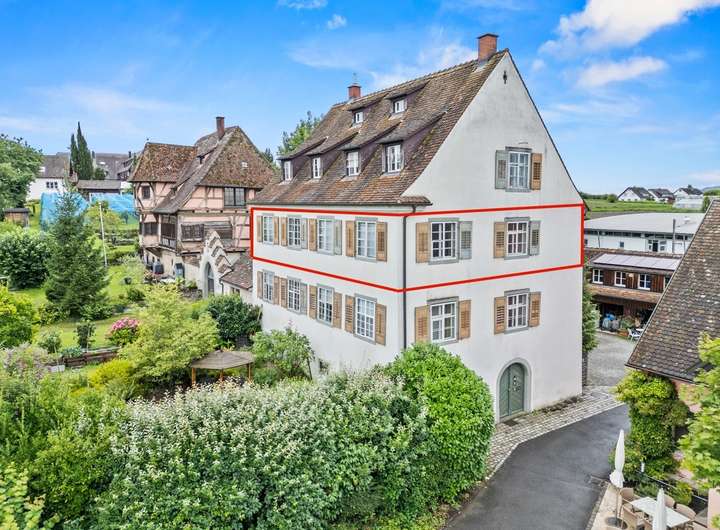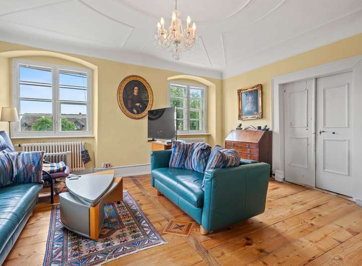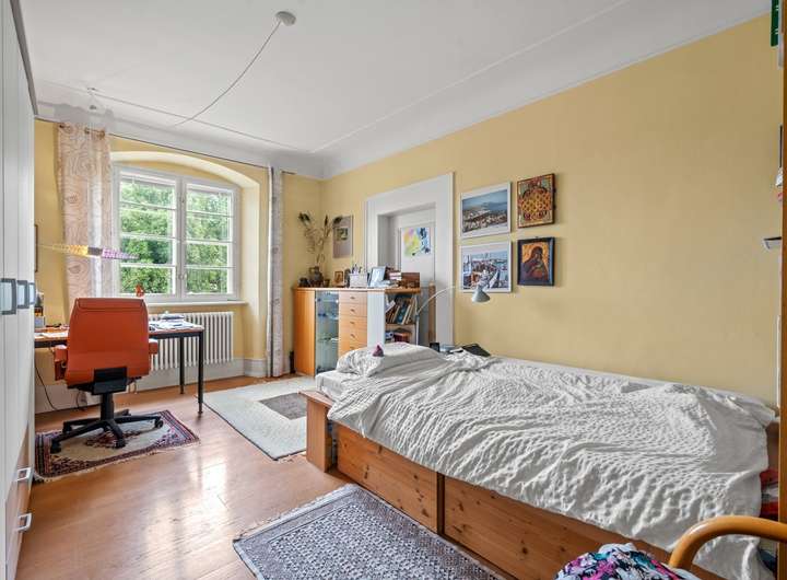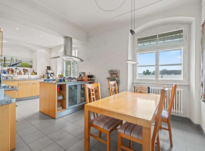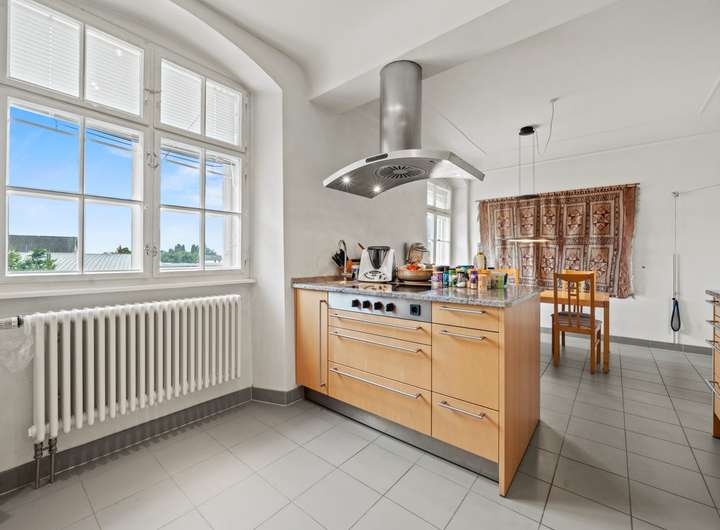 Im zweiten Obergeschoss befindet sich eine großzügige 3,5-Zimmer-Wohnung mit ca. 123,25 m² Wohnfläche und einem sonnigen Balkon. Die Wohnräume sind durch Türen miteinander verbunden, wodurch ein harmonischer und fließender Grundriss entsteht. Helle Räume und der behutsame Erhalt historischer Details schaffen hier ein unvergleichlich angenehmes Wohnambiente. Mittelpunkt der Wohnung ist eine große Wohnküche, die zum geselligen Beisammensein einlädt. Für behagliche Wärme sorgt hier zusätzlich ein Kaminofen, der neben der zentralen Heizung für ein gemütliches Ambiente sorgt.