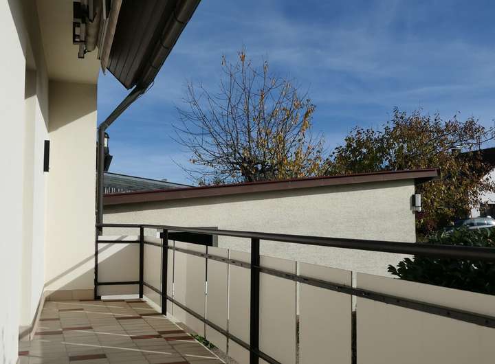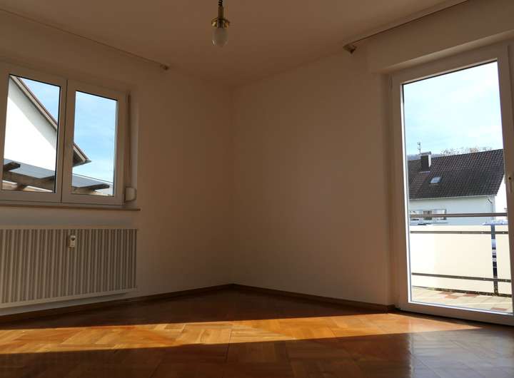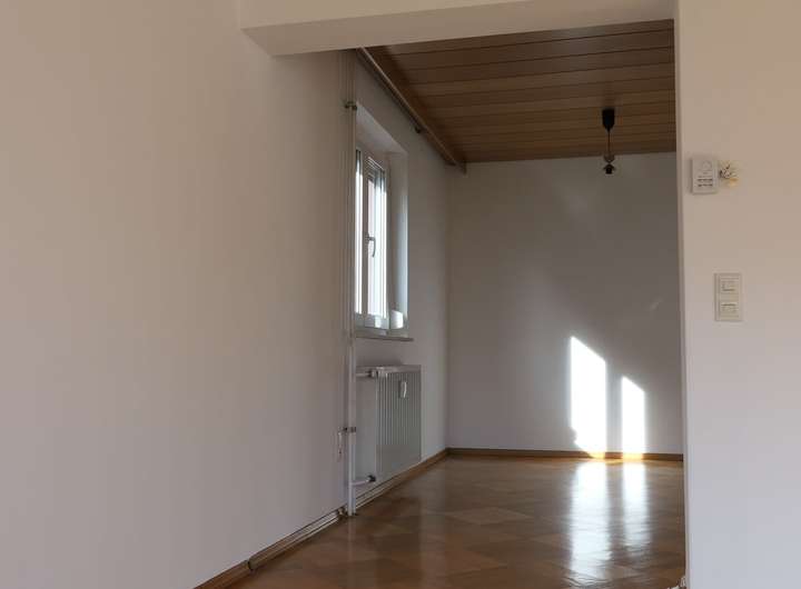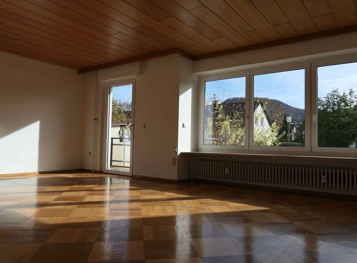 - großzügiger Wohn-Essbereich mit Vollholzparkettboden, Zugang zum Balkon an der Südseite mit elektrischer Markise