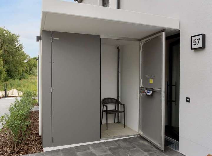 - Jedes Haus verfügt über zwei Außenstellplätze, sowie hausabhängig zum Teil auch über ein eigenes Carport