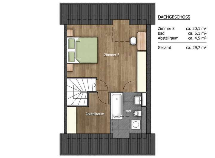 4 Zimmer, verteilt auf etwa 120 m², stehen Dir bei der kleineren Variante der beiden Haustypen, zur Verfügung.