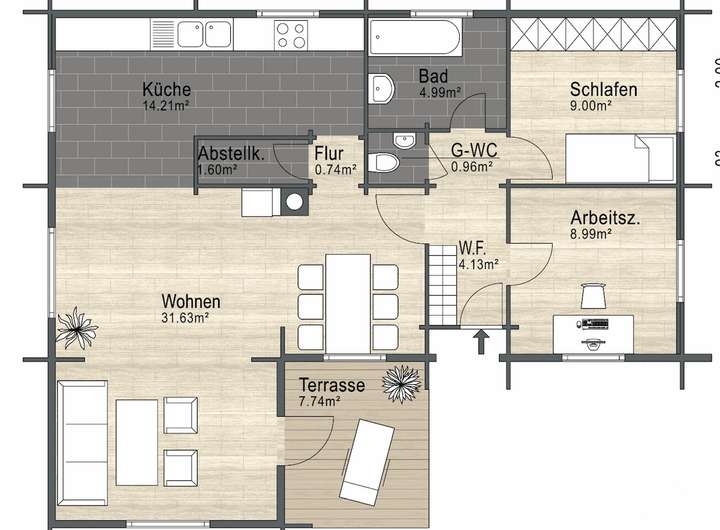 Die offene Küche ist nicht nur im Kaufpreis enthalten, sondern überzeugt auch mit einem praktischen Detail: Eine Durchreiche verbindet den Kochbereich direkt mit dem Wohnzimmer – so bleiben Sie immer im Kontakt mit Ihren Gästen und können kulinarische Highlights ganz entspannt servieren.