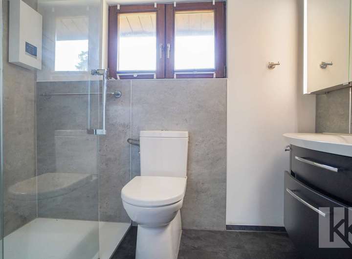 Weiter im Kern des Hauses erwartet Sie ein modernes, frisch saniertes Badezimmer mit ebenerdiger Dusche – eine kleine Wellness-Oase, die zum Abschalten und Entspannen einlädt. Nebenan befindet sich ein praktisches Gäste WC.