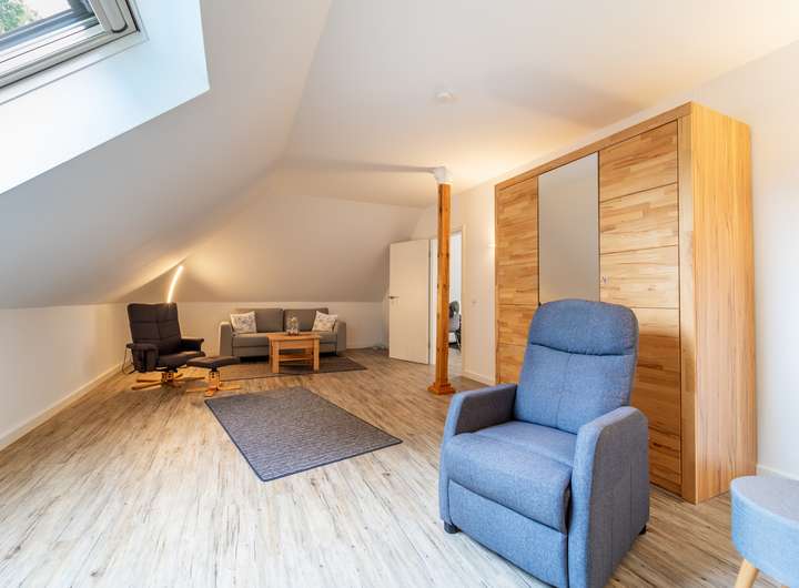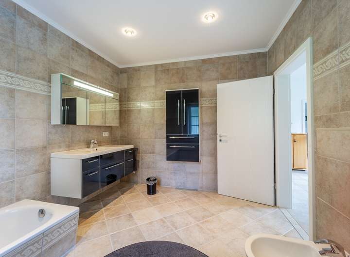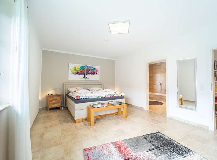 Das Erdgeschoss überzeugt mit einem einladenden, großzügigen Eingangsbereich. Der lichtdurchflutete Wohn- und Essbereich mit bodentiefen Fensterflächen bietet Zugang zur weitläufigen Terrasse und wird durch einen Kamin mit Glasschiebetür zum Mittelpunkt des Familienlebens. Die offene, helle Küche ist mit hochwertigen Elektrogeräten ausgestattet und verbindet Design mit Funktionalität. Zwei stilvolle Bäder – ein Duschbad sowie ein Wannenbad mit Bidet – ergänzen den Komfort auf dieser Ebene. Zudem stehen ein Hauswirtschaftsraum, ein Heizungsraum, ein weiteres Schlaf- oder Gästezimmer sowie ein Ankleidezimmer zur Verfügung. Im gesamten Erdgeschoss unterstreichen hochwertige Fliesen den modernen Charakter. Im Dachgeschoss erwarten Sie zwei großzügige Räume, die sich flexibel als Schlaf-, Arbeits- oder Hobbybereiche nutzen lassen. Hinzu kommen zwei moderne Duschbäder mit ebenerdigen Duschen sowie ein weitläufiger Flurbereich, der aktuell als Fitnesszone genutzt wird. Edler Vinylboden rundet die Gestaltung dieser Ebene ab. Die Immobilie bietet zahlreiche Highlights: eine Doppelgarage, zwei Karibu-Gartenhäuser, zwei XXL-Hochbeete sowie eine große, sonnige Terrasse für entspannte Stunden im Freien. Weitere Ausstattungsmerkmale wie Funk-Alu-Rollläden im Erd- und Dachgeschoss, Innenrollos, eine vollständige LED-Beleuchtung, Bewegungsmelder mit Rundumbeleuchtung sowie die energetische Komplettrenovierung von 2019–2020 unterstreichen den hochwertigen Gesamtzustand dieser Immobilie.