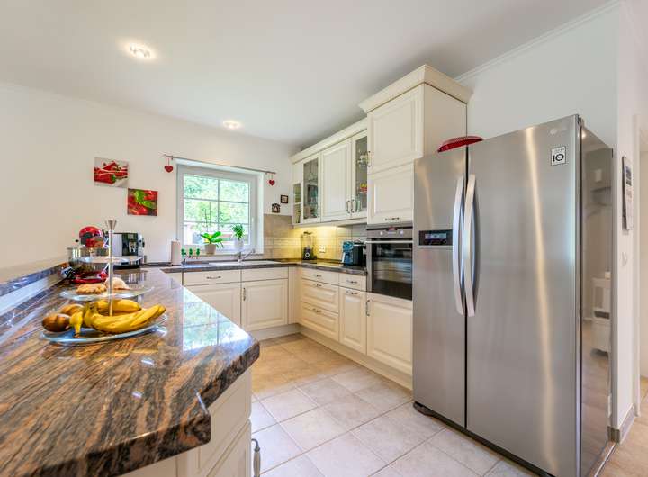 -Offene helle Küche mit hochwertigen Elektrogeräten