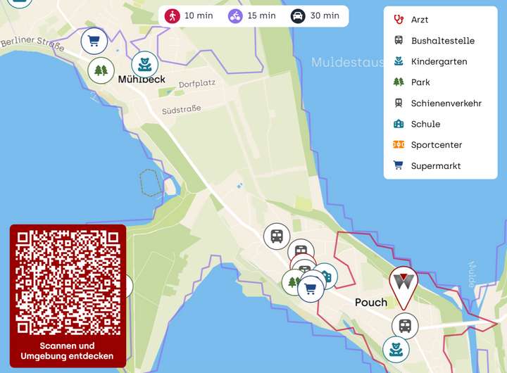 Der Ortsteil Pouch strahlt eine ruhige, naturnahe Atmosphäre mit dörflichem Charme aus, eingebettet in weitläufige Auenlandschaften und direkt an gleich zwei Gewässern gelegen.