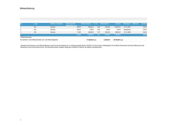 (*) Die Angaben zu den Mieteinnahmen stammen vom Eigentümer (Stand: September 2025). Für deren Richtigkeit und Vollständigkeit übernimmt die Planet Home Group GmbH keinerlei Haftung.