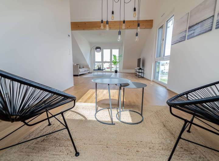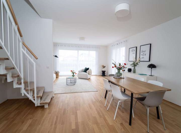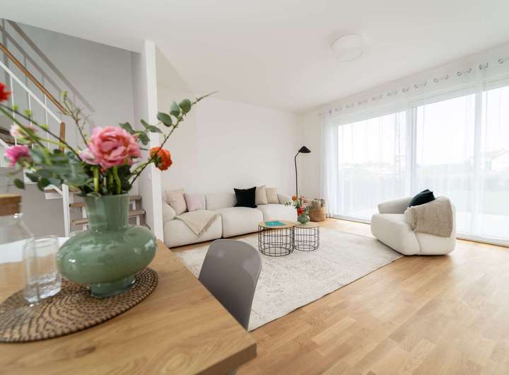 - 5 Zimmer auf ca. 142 m² Wohnfläche - Flexible Grundrissgestaltung - Terrasse mit Garten - Dreifach verglaste, teilweise bodentiefe Fenster - Edles Eiche-Echtholzparkett - Fußbodenheizung mit Free-Cooling - Tageslichtbad - Hochwertige Sanitärobjekte - Gäste-WC - Hauswirtschaftsraum - PKW-Stellplatz in der eigenen Garage (optional) bzw. direkt am Haus - Umweltfreundliche Energieversorgung durch Geothermie - Photovoltaikanlage - Effizienzhaus 55-Standard - Sm@rt Home Ready GEOTHERMIE Kein Öl, kein Gas. Sondern Erdwärme. Aus natürlichen Ressourcen können Sie Ihr Zuhause mit Energie versorgen. Ganz umweltfreundlich, nachhaltig, unabhängig und gut für Ihren Geldbeutel. PHOTOVOLTAIK Umweltfreundlich und emissionsfrei. Erzeugen Sie Ihren eigenen, kosten- günstigen und sauberen Strom. Perfektes Add-On zu der nachhaltigen Energieversorgung durch Geothermie. EFFIZIENZHAUS 55-STANDARD Die Effizienzhaus-Stufen ergeben sich aus der Kombination verschiedener baulicher und technischer Maßnahmen, vor allem aus den Bereichen Heizung, Lüftung und Dämmung. Der Effizienzhaus 55-Standard für Neubauimmobilien stellt den Primärenergiebedarf im Vergleich zu einem Referenzgebäude dar. Somit werden 45% des Primärenergiebedarfs eingespart. SM@RT HOME READY Der Grundstein für Ihr vernetztes Zuhause ist gelegt. Mit Sm@rt Home Ready können Sie ganz einfach jederzeit die intelligente Haustechnik installieren – mit genau den Funktionen, die für Ihren Alltag am geeignetsten sind. FUSSBODENHEIZUNG MIT FREE-COOLING Die Fußbodenheizung sorgt im Winter für wohlige Wärme. Und der besondere Vorteil für Sie: Aufgrund der umweltfreundlichen Energieversorgung durch Geothermie können Sie den Free-Cooling-Effekt nutzen. Somit sorgt Ihre Fußbodenheizung für wunderbar kühle Temperaturen im Sommer.