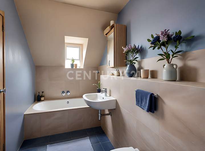 Tageslichtbad im Erdgeschoss mit Dusche und im Dachgeschoss mit Badewanne