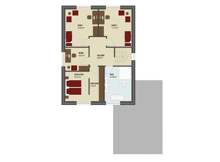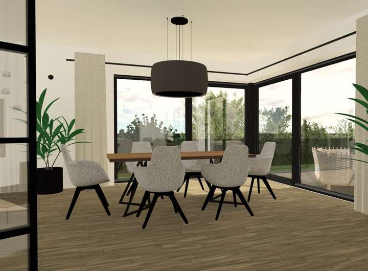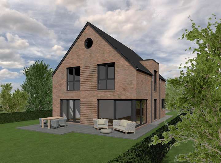 Dieses Einfamilienhaus verbindet zeitlose Architektur mit einem klaren, funktionalen Grundriss und schafft 169,41m² Wohnfläche nach DIN voller Licht, Raum und Wohlgefühl – ideal für Menschen, die Wert auf Komfort und modernes Wohnen legen. Bereits beim Betreten überzeugt der Eingangsbereich mit seiner großzügigen Diele und einer praktischen Garderobennische, die für ein stilvolles Ankommen sorgt. Das Herzstück des Hauses bildet der offen gestaltete Wohn-, Ess- und Kochbereich: Bodentiefe Fenster und weite Sichtachsen lassen viel Tageslicht herein und schaffen eine warme, einladende Atmosphäre. Besonders die Eckfenster im Wohn- und Küchenbereich setzen architektonische Akzente und verleihen dem Raum eine einzigartige Offenheit. Ergänzt wird das Erdgeschoss durch ein Gäste-WC, einen Technik- und Hauswirtschaftsraum sowie einen kleinen, clever integrierten Abstellraum unter der Treppe. Im Obergeschoss erwarten Sie durchdachte Rückzugsorte: Ein großzügiges Elternschlafzimmer mit Ankleide, zwei helle Kinderzimmer und ein komfortables Familienbad mit Dusche und Badewanne – perfekt, um entspannte Wellnessmomente zu genießen. Zusätzlich bietet ein Büroraum ideale Voraussetzungen für Homeoffice oder als flexibler Mehrzweckraum. Die schöne Terrasse sowie der Garten eröffnen vielfältige Möglichkeiten – ob sonnige Frühstücksmomente, Spielen im Grünen oder entspannte Abende mit Familie und Freunden.