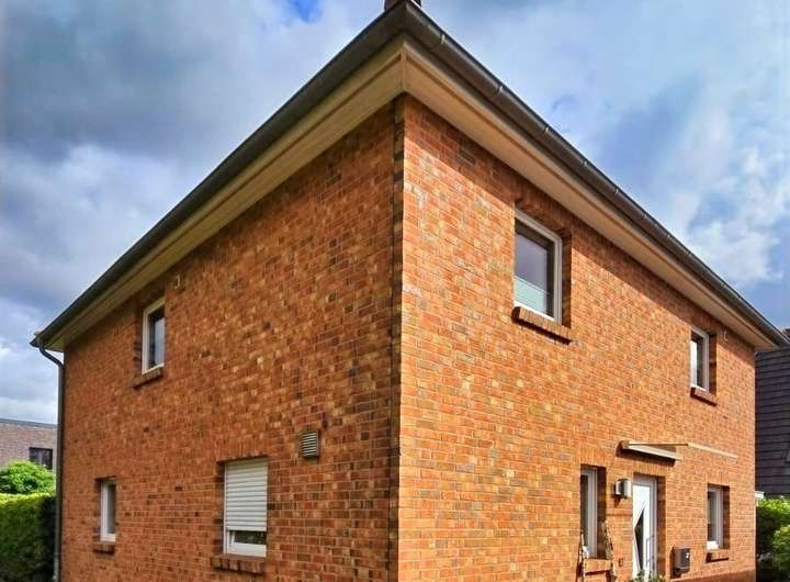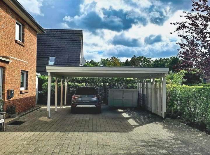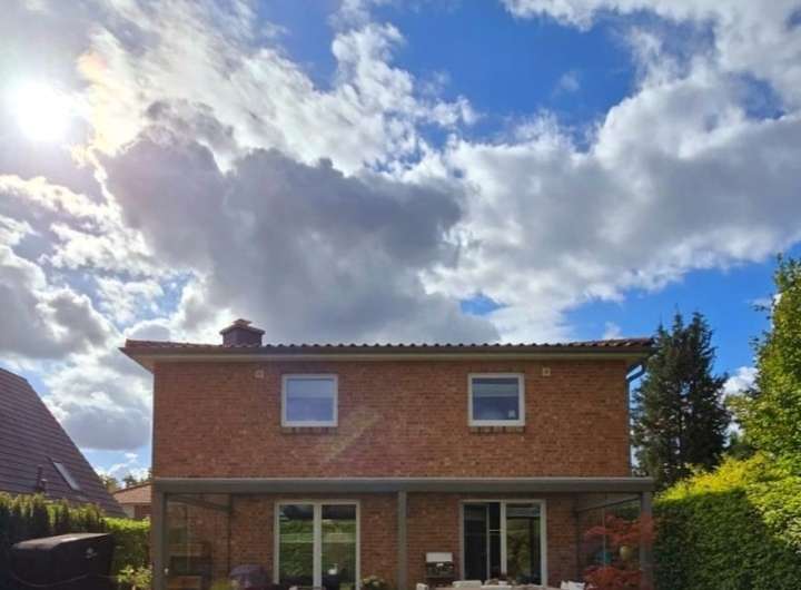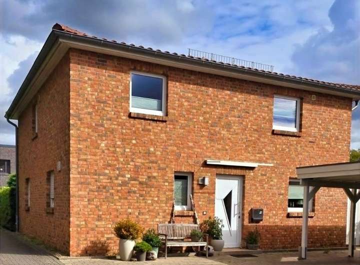 Zum Verkauf steht ein solides, 2012 errichtetes Einzelhaus in klarer, moderner Architektur. Der zweigeschossige Bau mit roter Klinkerfassade und Satteldach fügt sich harmonisch in die Umgebung ein und besticht durch seine schlichte Eleganz. Vor dem Eingangsbereich befinden sich ein großzügiger Doppel-Carport mit angrenzendem Schuppen sowie eine gepflasterte Einfahrt.
