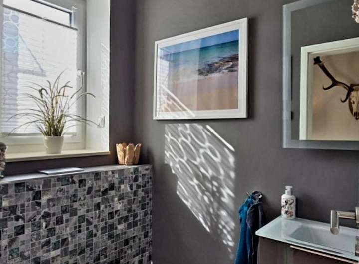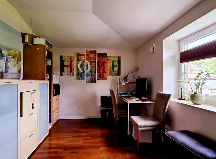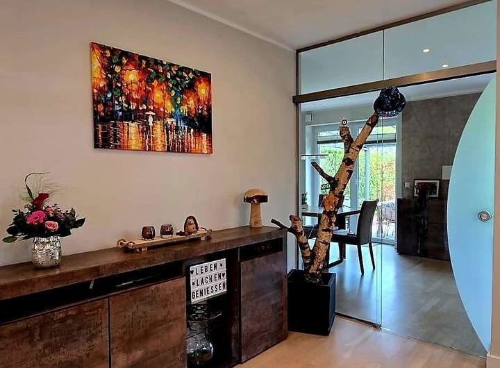 Willkommen im hellen Flur, der mit einer Glasschiebetür vom Wohnbereich abtrennbar ist. Im Erdgeschoss finden Sie ein 2019 vollständig renoviertes Gäste-WC, ein vielseitig nutzbares Zimmer (z. B. Büro) sowie den Hauswirtschaftsraum mit viel Stauraum, zusätzlichem Waschmaschinenanschluss und der Technik für Belüftung und Wärmepumpe.