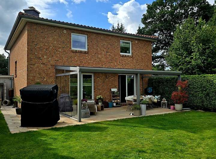 An warmen Sommerabenden sitzen Sie geschützt unter dem Glasdach, während die elektrischen Markisen für angenehmen Schatten sorgen. An kühleren Tagen schließen Sie einfach die Glaswände und schaffen so einen gemütlichen Raum im Freien, der dennoch den Blick in den Garten öffnet.