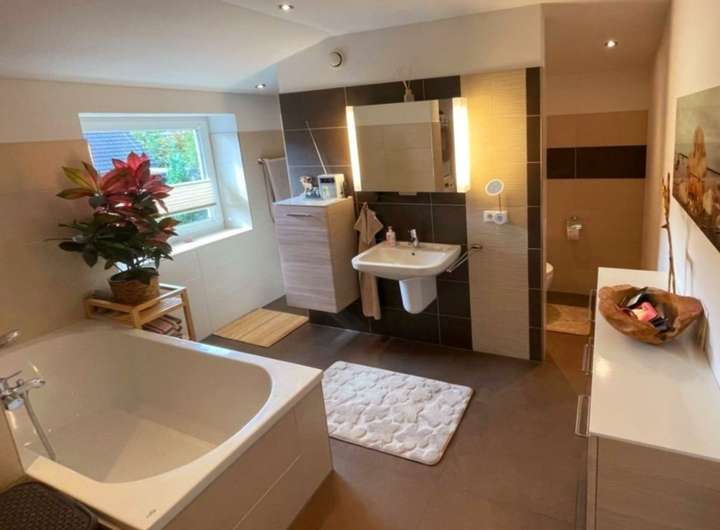 Über eine elegante Holztreppe gelangen Sie ins Obergeschoss mit insgesamt vier Zimmern – ideal als Schlaf-, Kinder- oder Arbeitszimmer. Alle Räume sind mit edlem Echtholzparkett und Marmorfensterbänken ausgestattet. Das durchdacht und gut gestaltete Badezimmer bietet eine große Badewanne, eine begehbare Dusche, einen Handtuchheizkörper sowie Platz für Waschmaschine und Trockner.