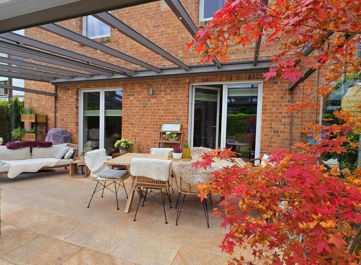 Die Terrasse ist ein echtes Highlight dieser Immobilie – ein Ort, an dem Sie unvergessliche Stunden mit Familie und Freunden verbringen können. Großzügig gefliest, mit einem eleganten Glasdach und flexiblen Glas-Seitenwänden ausgestattet, lässt sie sich bei jedem Wetter genießen.