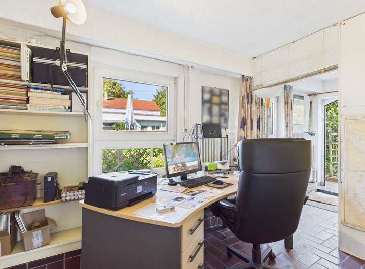 Über eine innenliegende Treppe gelangen Sie ins Erdgeschoss, in welchem sich private Rückzugsräume befinden: ein gemütliches Schlafzimmer, ein weiteres Büro, ein zusätzliches Badezimmer sowie ein großzügiger Flur, welcher derzeit als Ankleidezimmer dient.