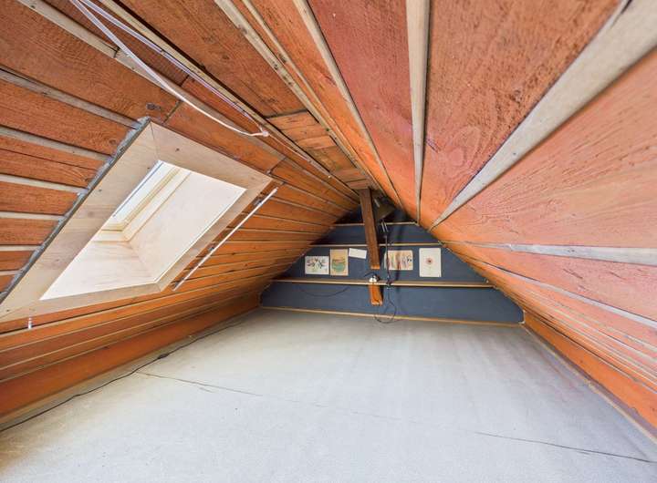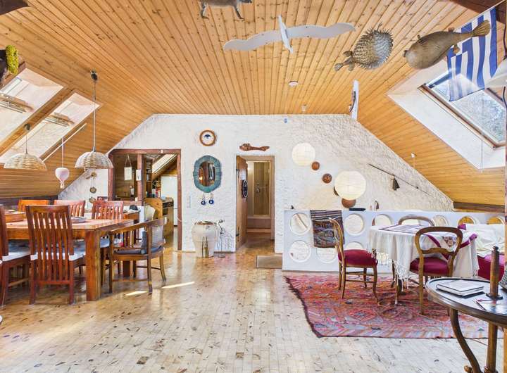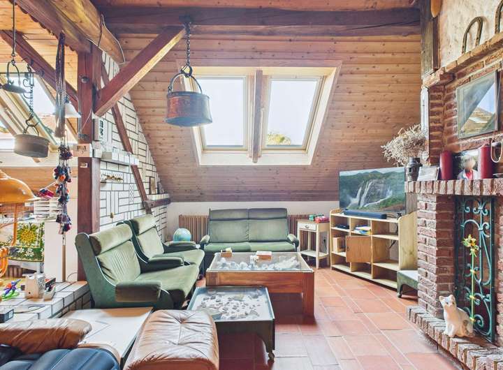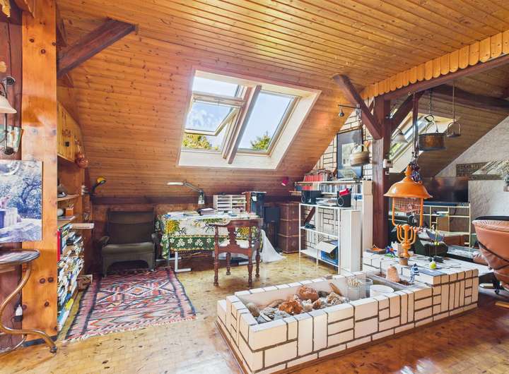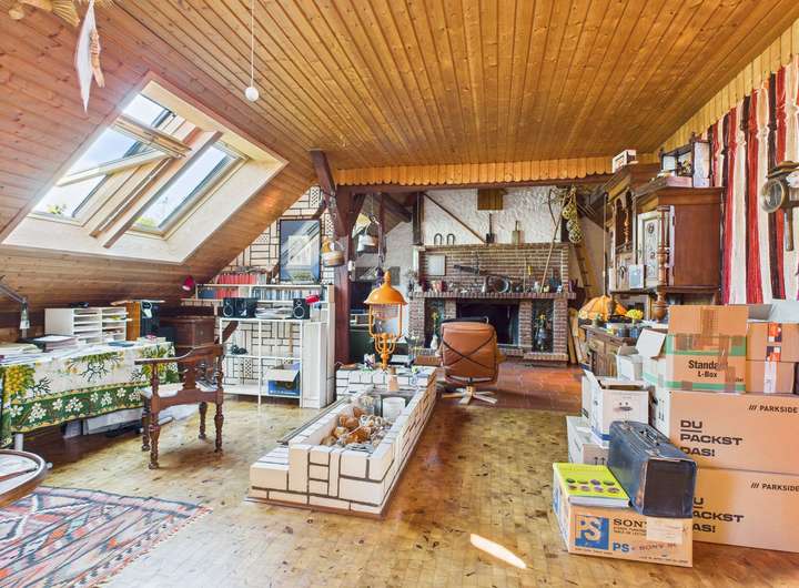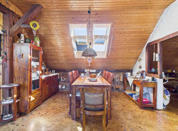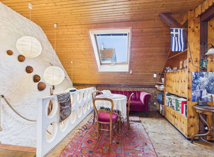 Im Obergeschoss eröffnet sich ein beeindruckender, loftartiger Wohnbereich, welcher aktuell als Wohn-, Ess- und Arbeitsraum genutzt wird. Die Kombination aus offener Raumgestaltung, sichtbaren Balkenelementen und großzügiger Deckenhöhe schafft ein einzigartiges Wohnambiente mit viel Luft und Licht.