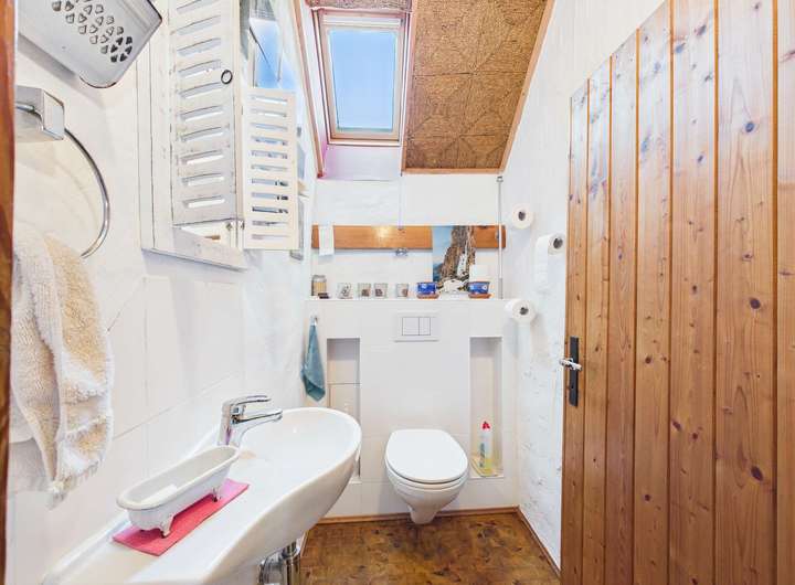 Eine voll ausgestattete Küche, ein stilvolles Badezimmer sowie ein separates Gäste-WC runden das Raumangebot auf dieser Etage ab.