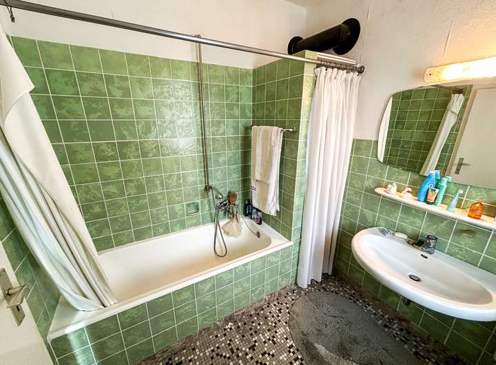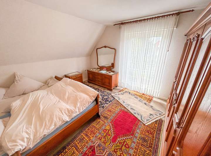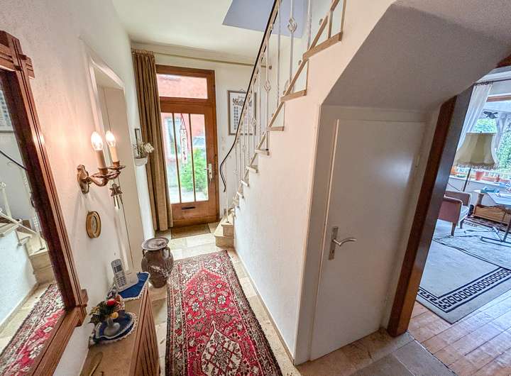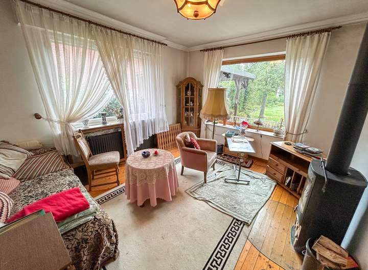 Im Erdgeschoss empfängt Sie ein weitläufiges Wohn-Esszimmer, das mit einem edlen Fischgrät-Parkettboden beeindruckt. Die angrenzende Küche mit gemütlicher Sitzgelegenheit sowie das Badezimmer mit Badewanne vervollständigen das Raumangebot auf dieser Ebene. Ein besonderes Highlight ist das Kaminzimmer, welches einen malerischen Blick in den grünen Garten eröffne