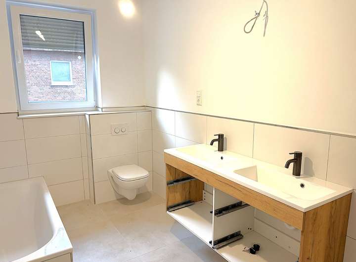 - Badezimmer im Obergeschoss mit Wanne, ebenerd. Dusche, Doppelwaschtisch und WC
