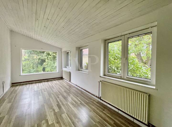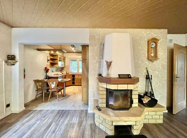 Beim Betreten der Immobilie eröffnet sich eine Diele, von der ein weiterer Flur abgeht. Auf der linken Seite befinden sich zwei Zimmer, welche geschickt miteinander verbunden sind. Ein größeres geräumiges Zimmer schließt sich an und eignet sich hervorragend als Schlafzimmer. Der Wohnbereich ist offen gestaltet. Es verfügt über gemütlichen Kamin, der für eine behagliche Atmosphäre sorgt und den Raum mit wohliger Wärme an kalten Tagen versorgt. Vom Wohnzimmer aus gelangt man nicht nur in die praktische Küche, welche mit allen nötigen Geräten ausgestattet ist, sondern auch in den lichtdurchfluteten Wintergarten mit Zugang in den Garten und zu einem weiteren Zimmer, das zusätzliche Nutzungsmöglichkeiten bietet. Das Badezimmer überzeugt mit einer komfortablen Eckbadewanne und einer praktischen Dusche. Darüber hinaus ist das Haus teilweise unterkellert und bietet somit zusätzlichen Stauraum.