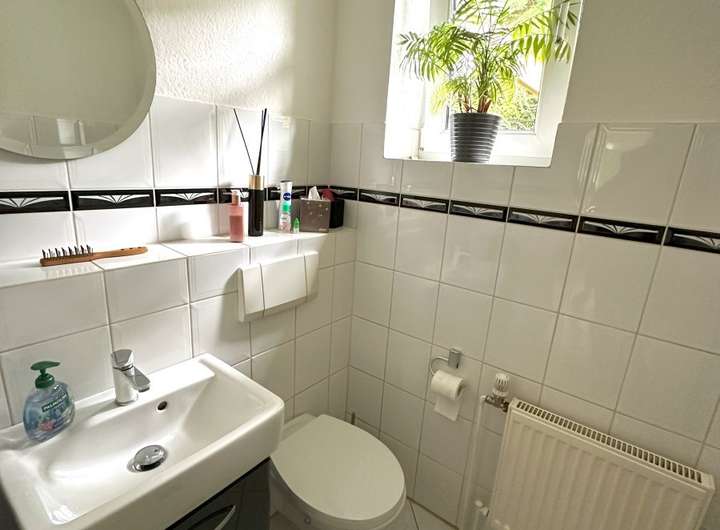 Ferner befindet sich im Erdgeschoss ein ca. 2,03 m² großes Gäste-WC mit modernen, weißen Sanitärobjekten, weißen Fliesen sowie einem Fenster.