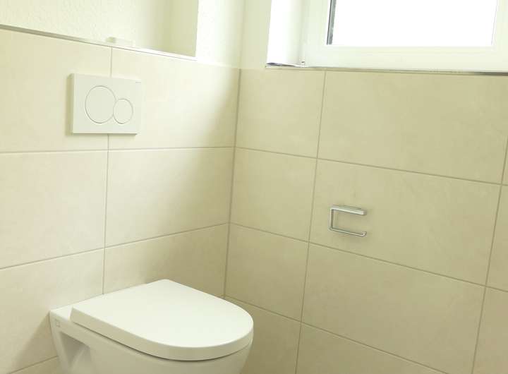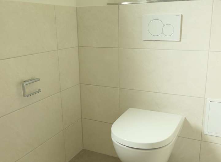 Das Tageslichtbad ist mit einem Doppelwaschbecken, einer Dusche und einem WC ausgestattet. Die Wohnung verfügt zusätzlich über ein Gäste-WC.