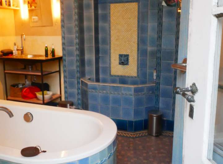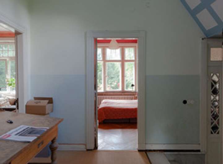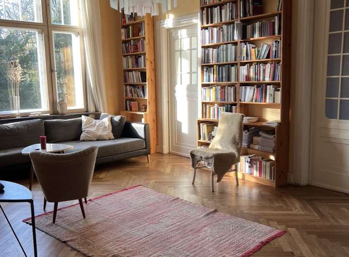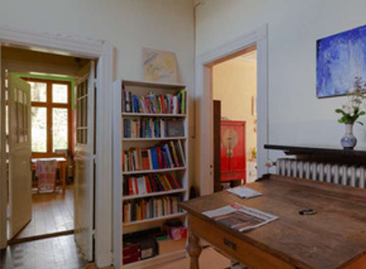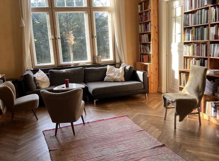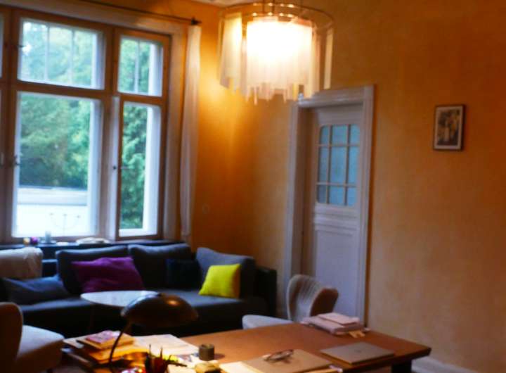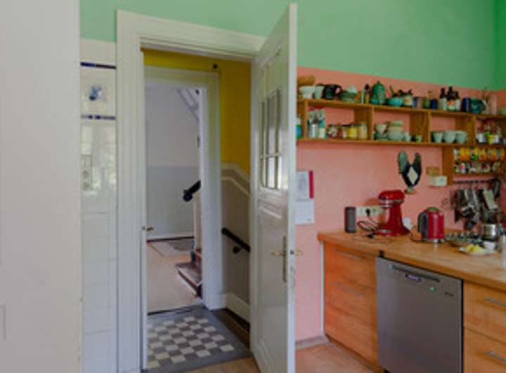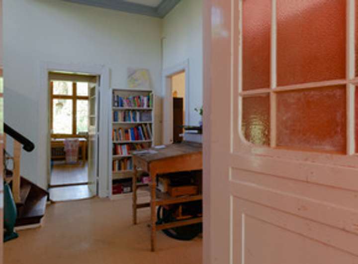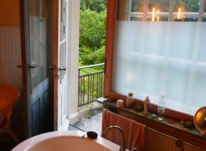 Die Küche besitzt neben der Heizung noch einen Holzherd, auf dem es Freude macht zu kochen. Für die Holzlagerung ist im Garten viel Platz. Auch ist es herrlich von der Küche über einen Balkon in den großartigen Garten zu gelangen. Das Wohnzimmer ist 28 qm, die Bibliothek ist 25 qm, das Herrenzimmer 15 qm groß. Ein ganz besonderes Highlight ist das Badezimmer, dass die jetzigen Eigentümer stilgerecht zur Architektur des Hauses in blauen Delfter Fliesen errichten ließen. Eine freistehende Badewanne nebst Fußbecken nach Kneipp Art lassen den Morgen wunderbar beginnen und am Abend ausklingen. Ganz schön dazu, dass man von der Badewanne in den Park schauen kann, und noch besser, wenn man die Terassentüre aufläßt und sich zum morgendlichen Frühstück bei einer Tasse Kaffee oder Tee auf der Terrasse darnieder läßt und der Blick über den Garten schweift. Kann man entspannter einen Tag beginnen?