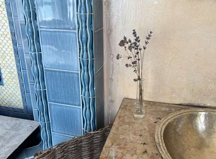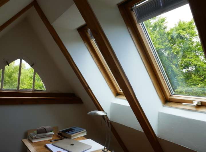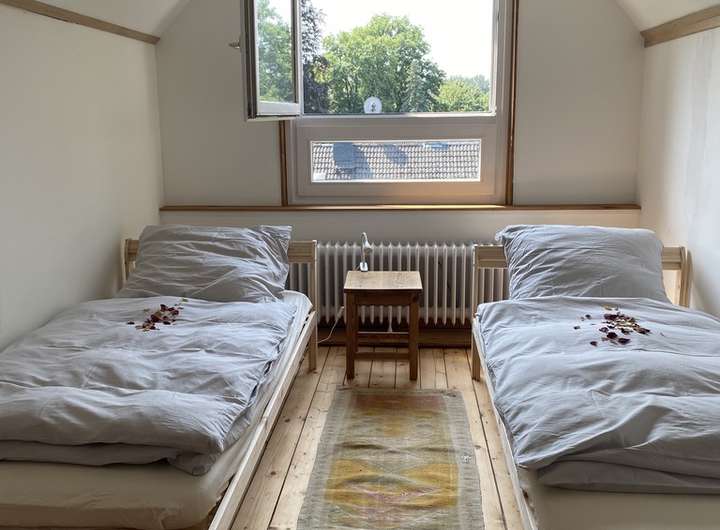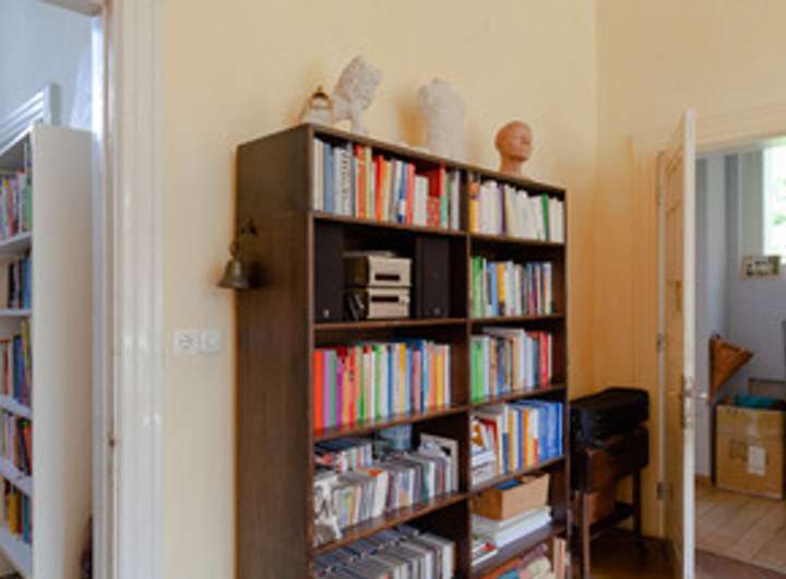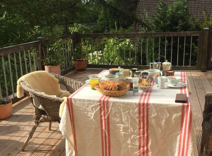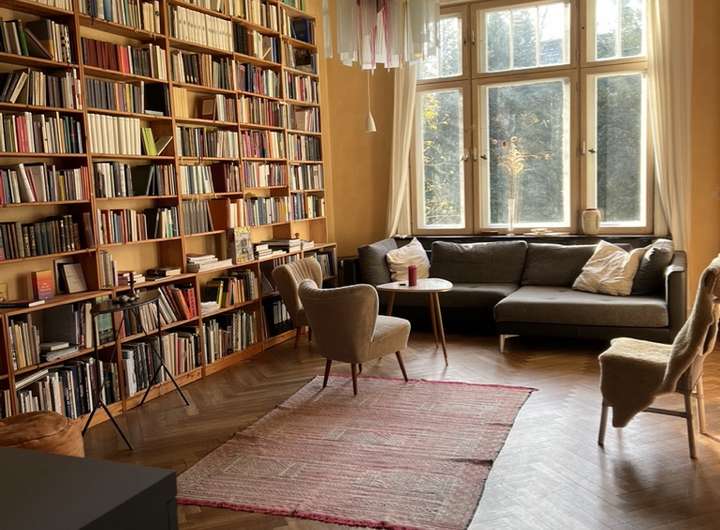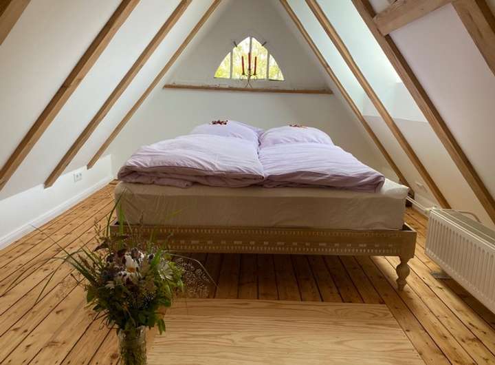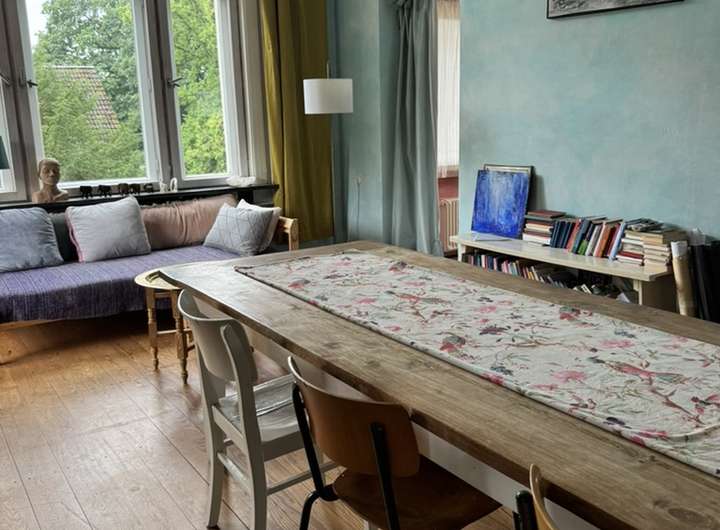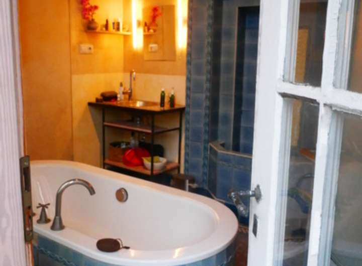 Die Küche besitzt neben der Heizung noch einen Holzherd, auf dem es Freude macht zu kochen. Für die Holzlagerung ist im Garten viel Platz. Auch ist es herrlich von der Küche über einen Balkon in den großartigen Garten zu gelangen. Das Wohnzimmer ist 28 qm, die Bibliothek ist 25 qm, das Herrenzimmer 15 qm groß. Ein ganz besonderes Highlight ist das Badezimmer, dass die jetzigen Eigentümer stilgerecht zur Architektur des Hauses in blauen Delfter Fliesen errichten ließen. Eine freistehende Badewanne nebst Fußbecken nach Kneipp Art lassen den Morgen wunderbar beginnen und am Abend ausklingen. Ganz schön dazu, dass man von der Badewanne in den Park schauen kann, und noch besser, wenn man die Terassentüre aufläßt und sich zum morgendlichen Frühstück bei einer Tasse Kaffee oder Tee auf der Terrasse darnieder läßt und der Blick über den Garten schweift. Kann man entspannter einen Tag beginnen?