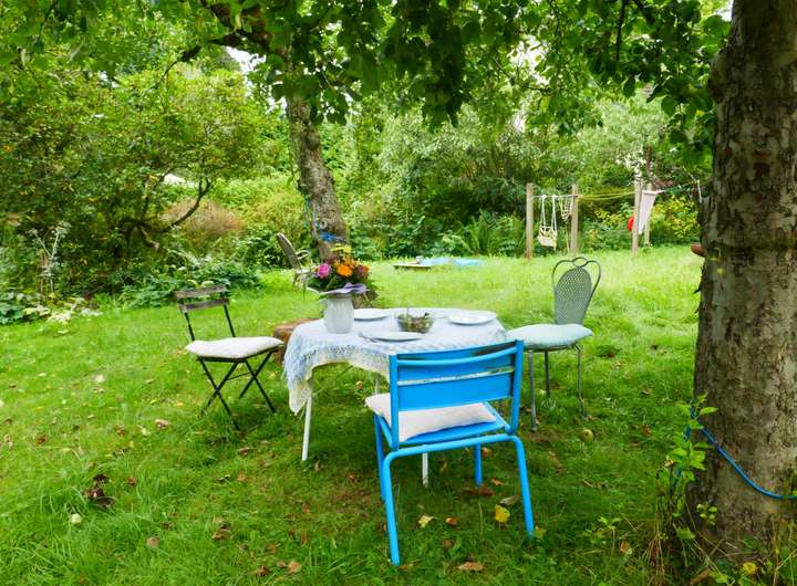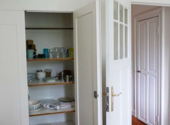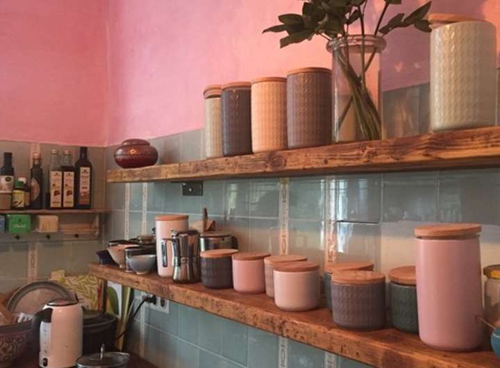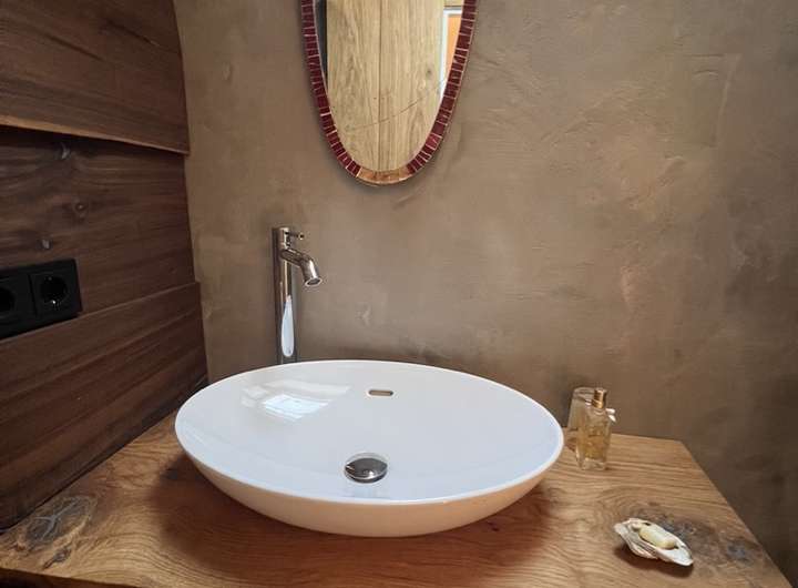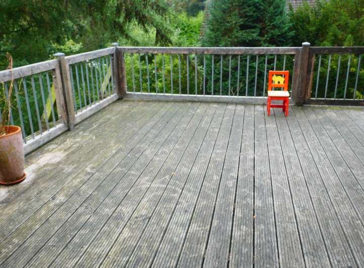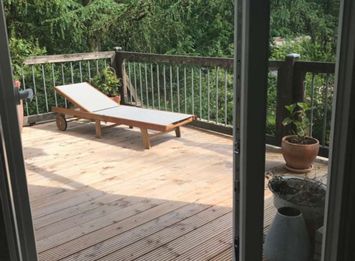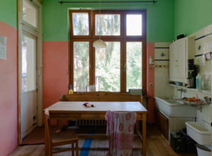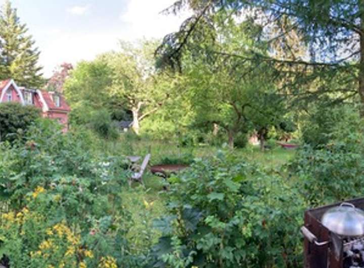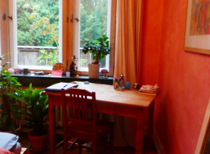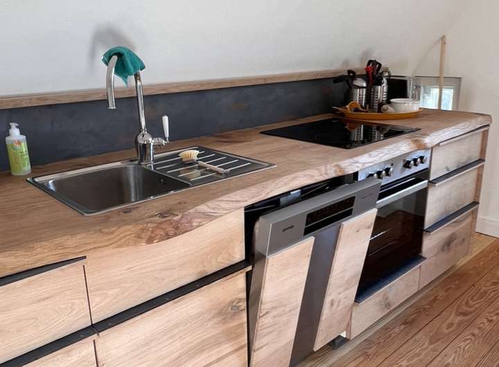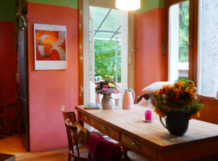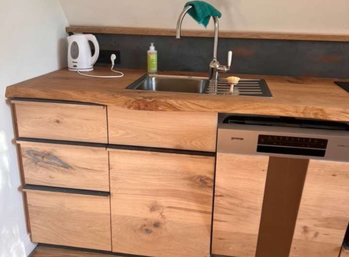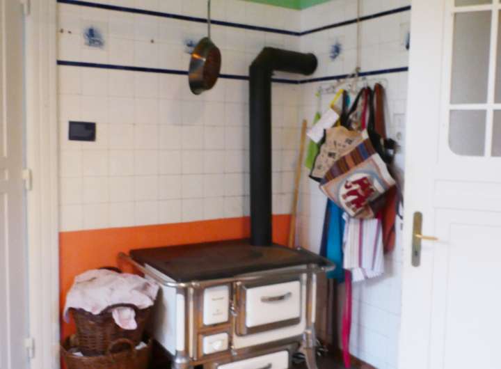 Die Küche besitzt neben der Heizung noch einen Holzherd, auf dem es Freude macht zu kochen. Für die Holzlagerung ist im Garten viel Platz. Auch ist es herrlich von der Küche über einen Balkon in den großen Garten zu gelangen.
