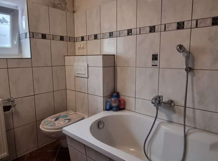 Weiterhin befinden sich auf dieser Etage der Anbau aus den 1980ern, das Badezimmer mit Badewanne und Fenster und das gemütliche Wohnzimmer. Von dem Wohnzimmer aus gelangen Sie direkt auf die schöne Terrasse und in den Garten.