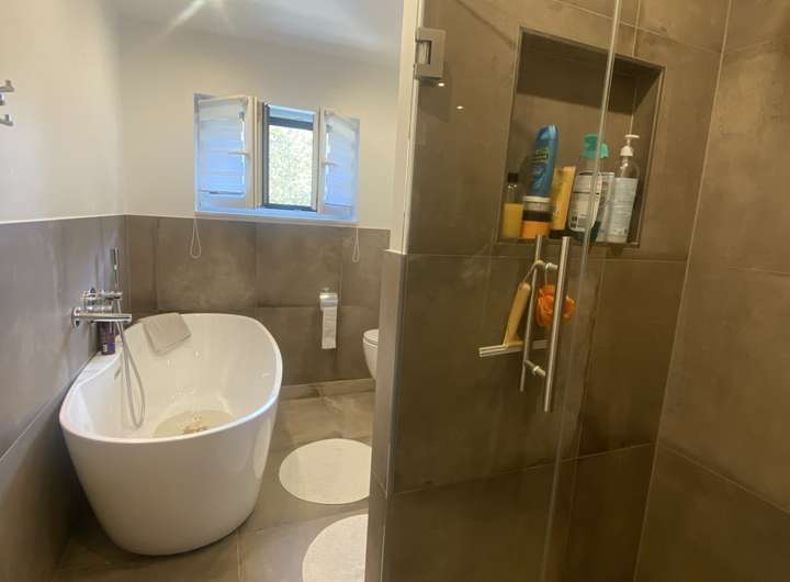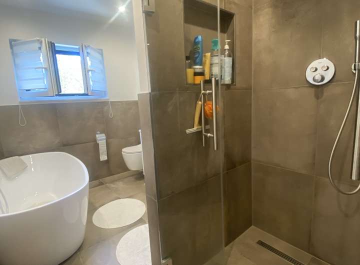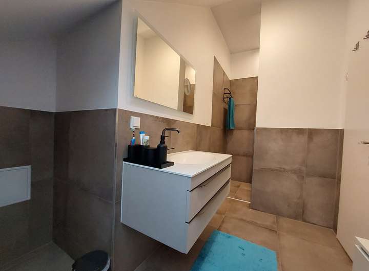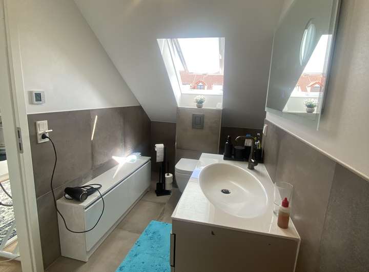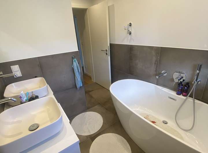 Das Tageslichtbad ist großzügig gestaltet: freistehende Badewanne, bodengleiche Dusche, elegante Armaturen und hochwertige Fliesen schaffen einen Raum für Erholung und Entspannung.