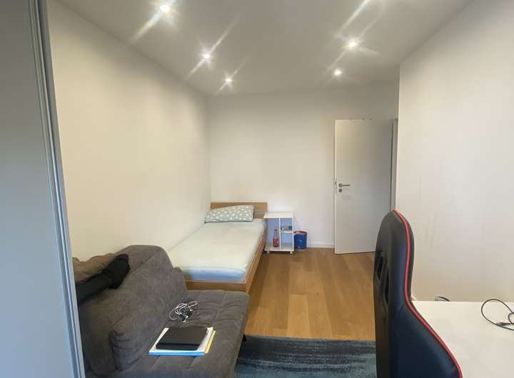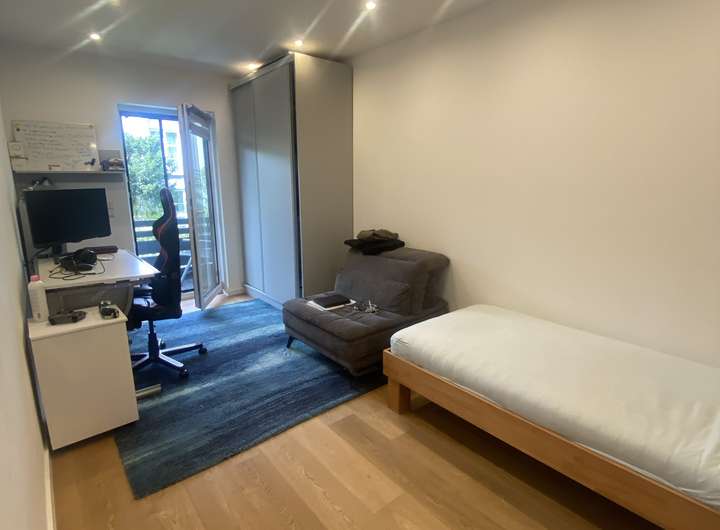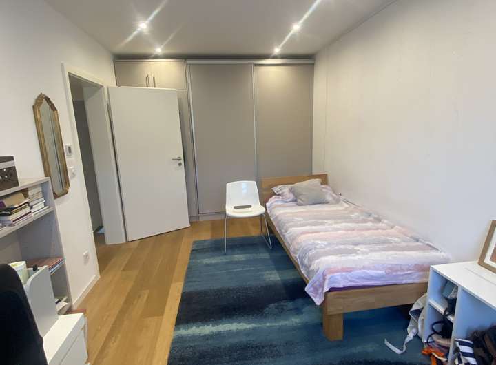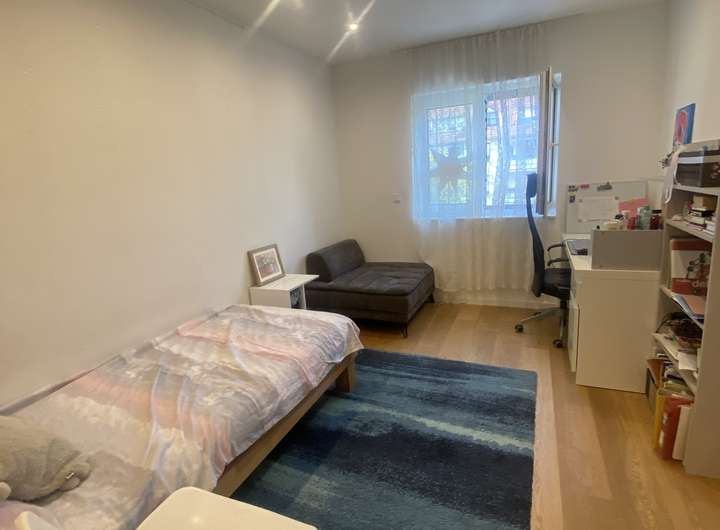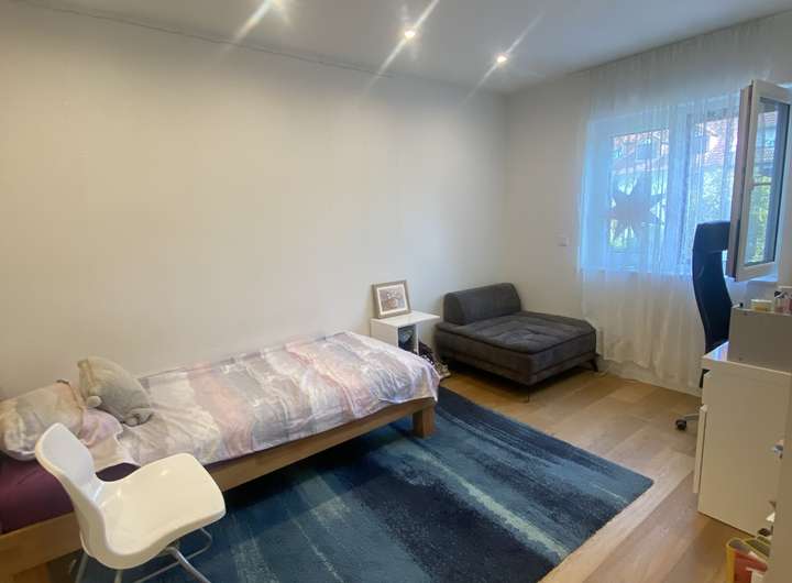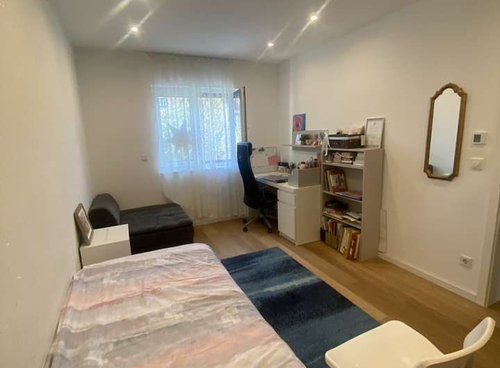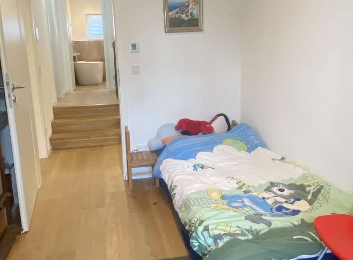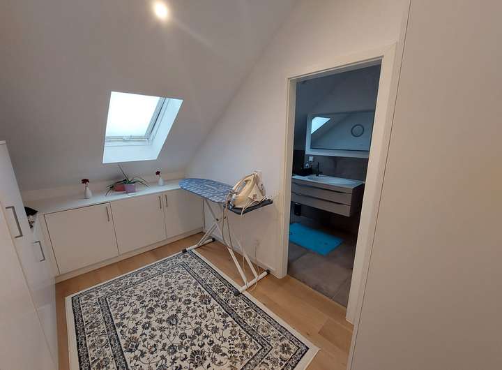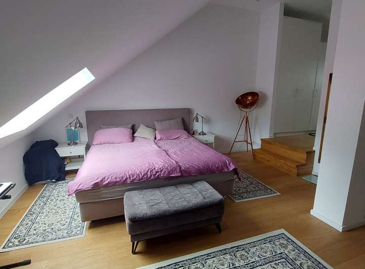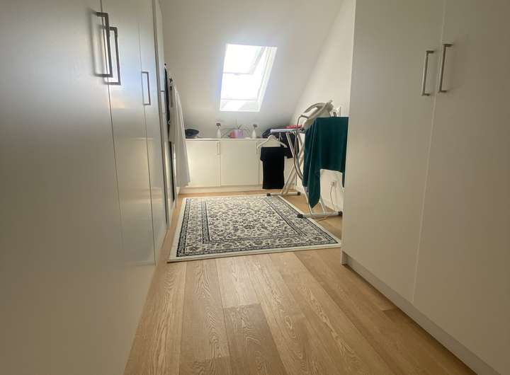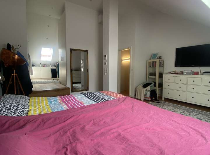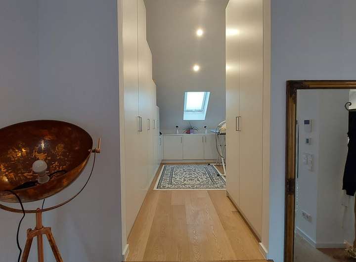 Das Dachgeschoss fungiert als großzügiger Masterbereich. Ein offenes Studio, Schlafbereich, separate Ankleide und ein Tageslicht Duschbad schaffen ein Rückzugsrefugium voller Licht und Behaglichkeit. Das Eichenparkett sorgt für Wärme und Wohnlichkeit.