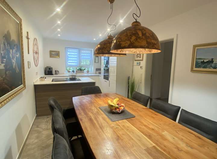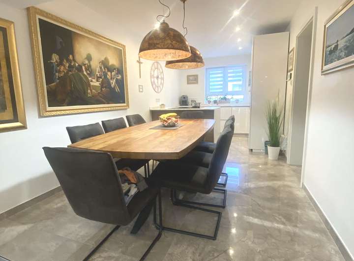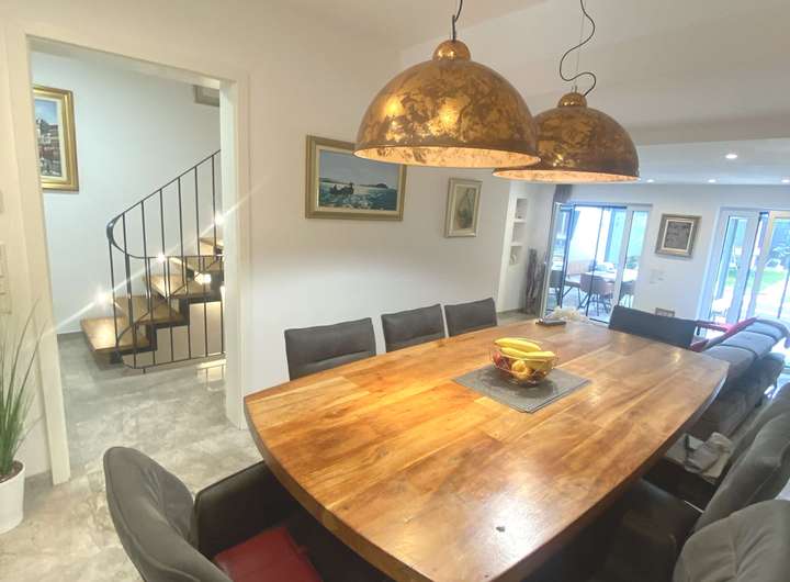 Der Wohn- und Essbereich entfaltet sich großzügig und lichtdurchflutet. Großformatige Fenster verbinden den Innenraum mit der Südwest-Terrasse, dem beheizten Wintergarten und dem Garten ein fließender Übergang von Wohnkultur zu Natur.