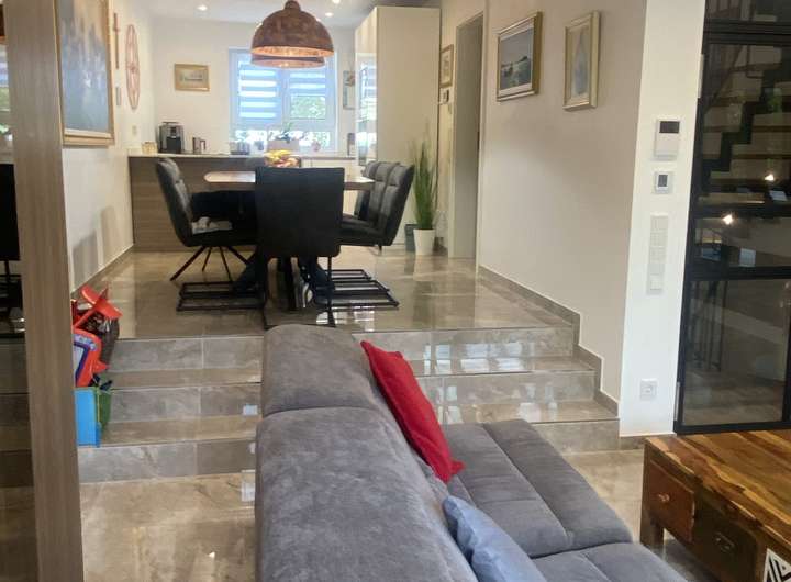 Dieses Haus vereint offene, fließende Raumgestaltung, hochwertige Küche auf Empore, fließende Übergänge zu Terrasse, Wintergarten und Garten sowie modernste Technik.