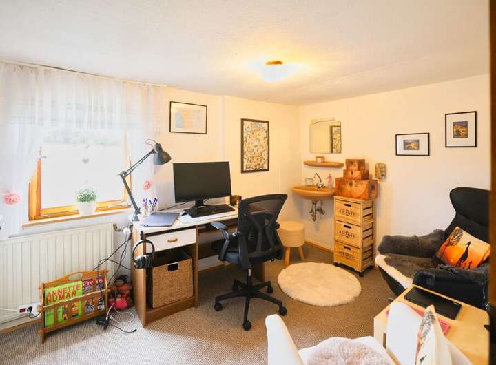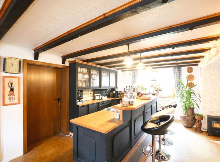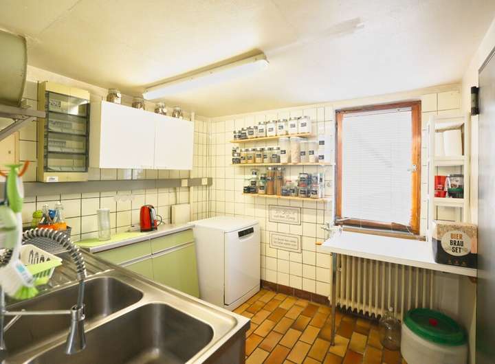 Im Erdgeschoss wurde die Immobilie ehemals als Gaststätte genutzt, was eine besonders großzügige und gut nutzbare Fläche bietet. Die großen Kunststofffenster, die im Jahr 2000 eingebaut wurden, lassen viel Licht in den Raum und sorgen für eine freundliche Atmosphäre. Die große Küche, voll ausgestattet mit praktischem Spülraum und Speisekammer, ist der perfekte Ort, um kulinarische Köstlichkeiten zu zaubern und Familientreffen zu einem genussvollen Erlebnis zu machen.