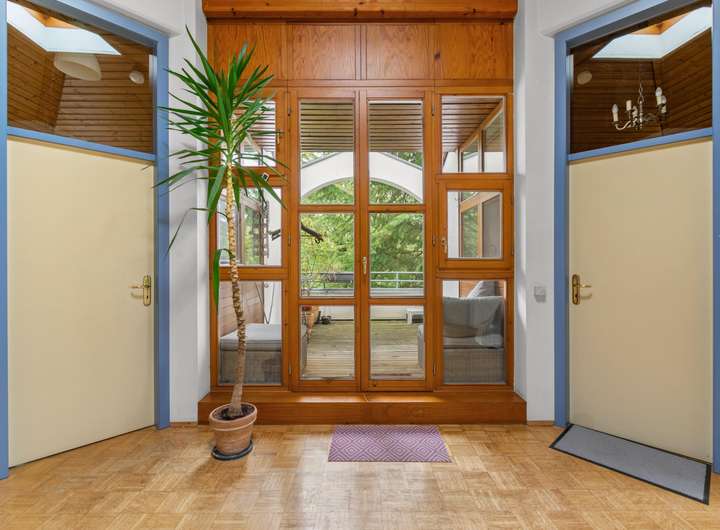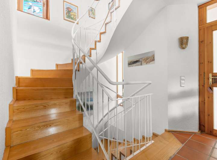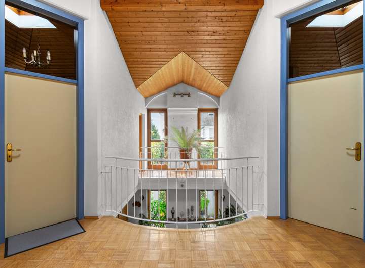 Eine mit Glasfliese bestückte Galerie im Obergeschoss, die einen Blick auf das Erdgeschoss frei gibt, eine gemütliche Kaminecke visuell abgetrennt vom restlichen Wohnbereich, Balkone in jedem der drei Obergeschosszimmer oder ein stimmiger Einliegerbereich im Untergeschoss. Diese Gesamtwohn-/Nutzfläche von rund 280m² ermöglicht Ihnen zahlreiche, individuelle Gestaltungs- und Nutzungsmöglichkeiten.