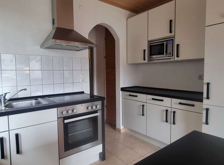 Diese führt zur schönen modernen Küche, mit angrenzendem Abstellraum, und einem praktischen Essbereich. Weitergehend kommen Sie durch eine stilvolle Glastür in das große Wohnzimmer.  Über das große Glaselement im Wohnzimmer kommen Sie auf die schöne Terrasse.