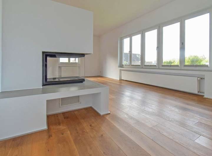 Durchgängig hochwertig, geschmackvoll und aus einem Guss gewählt, u.a. Vollholz-Parkettböden in allen Räumen, in Kombination mit feingeputzten Wänden und Altbau-Deckenhöhen. Weiße Holzfenster und Terrassentüren in klassischer 50er-Jahre-Einteilung mit Blendläden zur Vorder- und Rückseite. Design-Kamin im Wohn-/Essbereich. Zwei zeitlos chice, sehr komfortable Bäder, eines davon mit Sauna, ein zusätzliches Gäste-WC im gleichen Look.