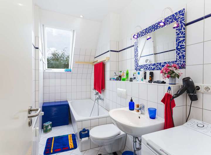 Rechterhand vor der Wohnküche befindet sich das Tageslichtbad mit Badewanne und praktischem Waschmaschinenanschluss.