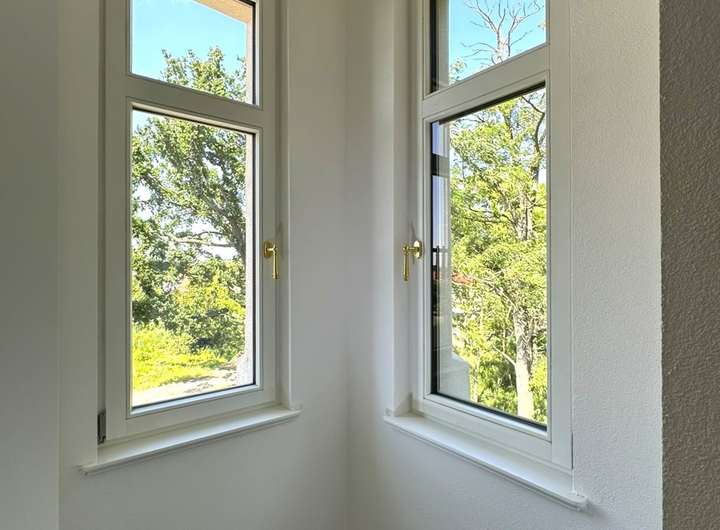 - Fenster: Hochwertige 2-fach verglaste Holzfenster (innen weiß, außen honigbraun)