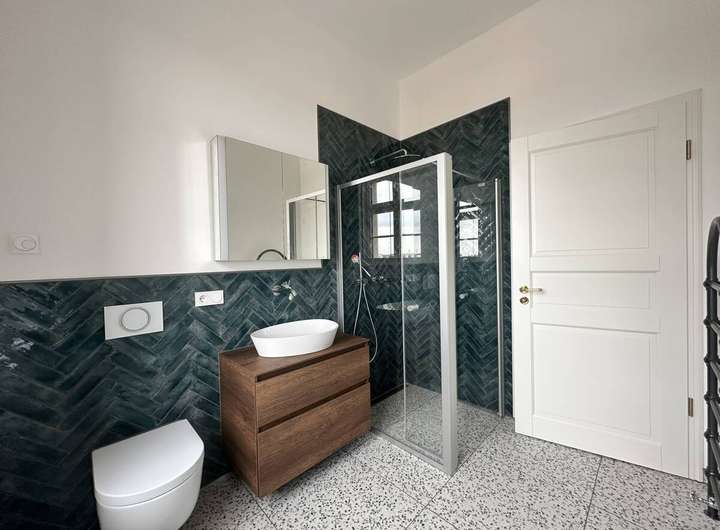 - Tageslichtbad mit edlen ozean-grünblauen Wandfliesen (Fischgrät) und grau-blau gesprenkelten Bodenfliesen
