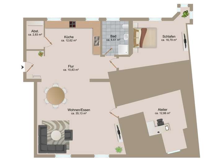 Das Objekt befindet sich derzeit noch in der Sanierungsphase. Die in den Grundrissen verwendeten Materialien, Farben und Möblierungen sind nur beispielhaft gewählt und dienen ausschließlich zur besseren Vorstellung und Visualisierung.