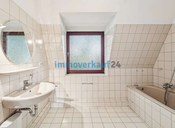 Das Erdgeschoss verfügt zudem über ein Gäste-WC, das mit einer Dusche und einem Fenster ausgestattet ist und somit auch funktional und alltagstauglich überzeugt. Im Obergeschoss befindet sich das geräumige Badezimmer mit Badewanne, das viel Platz bietet und ebenfalls ein großes Potenzial zur modernen Neugestaltung hat.