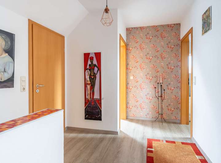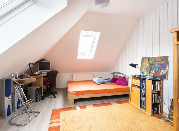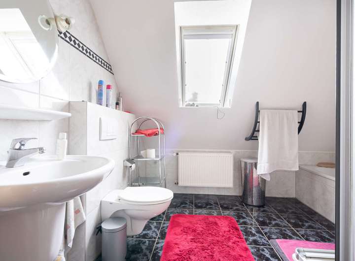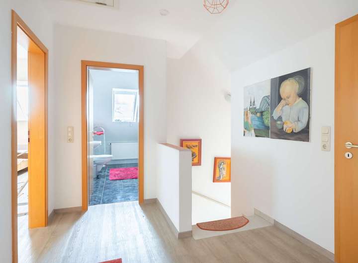 Im Obergeschoss befinden sich drei weitere Zimmer, die individuell genutzt werden können – ideal als Schlafzimmer, Kinderzimmer oder Büro. Das helle Tageslichtbad ist mit Dusche, Badewanne, Waschtisch und WC ausgestattet und bietet Komfort für die ganze Familie.